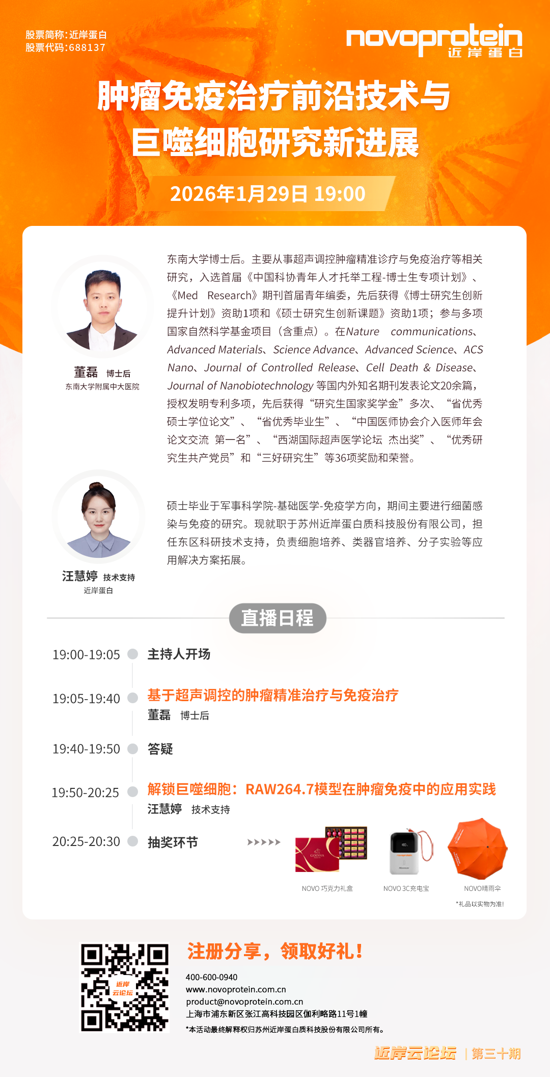 讲座预约通道已开启,欢迎报名参加。本次直播特别准备了NOVO巧克力礼盒、NOVO充电宝以及NOVO雨伞等重磅福利!期待与您齐聚一堂,探索肿瘤免疫治疗的前沿边界,解锁巨噬细胞研究的实操密码。无论是聚焦肿瘤研究,还是深耕免疫细胞研究的研究人员,都能在本次直播中收获启发与干货,我们不见不散!