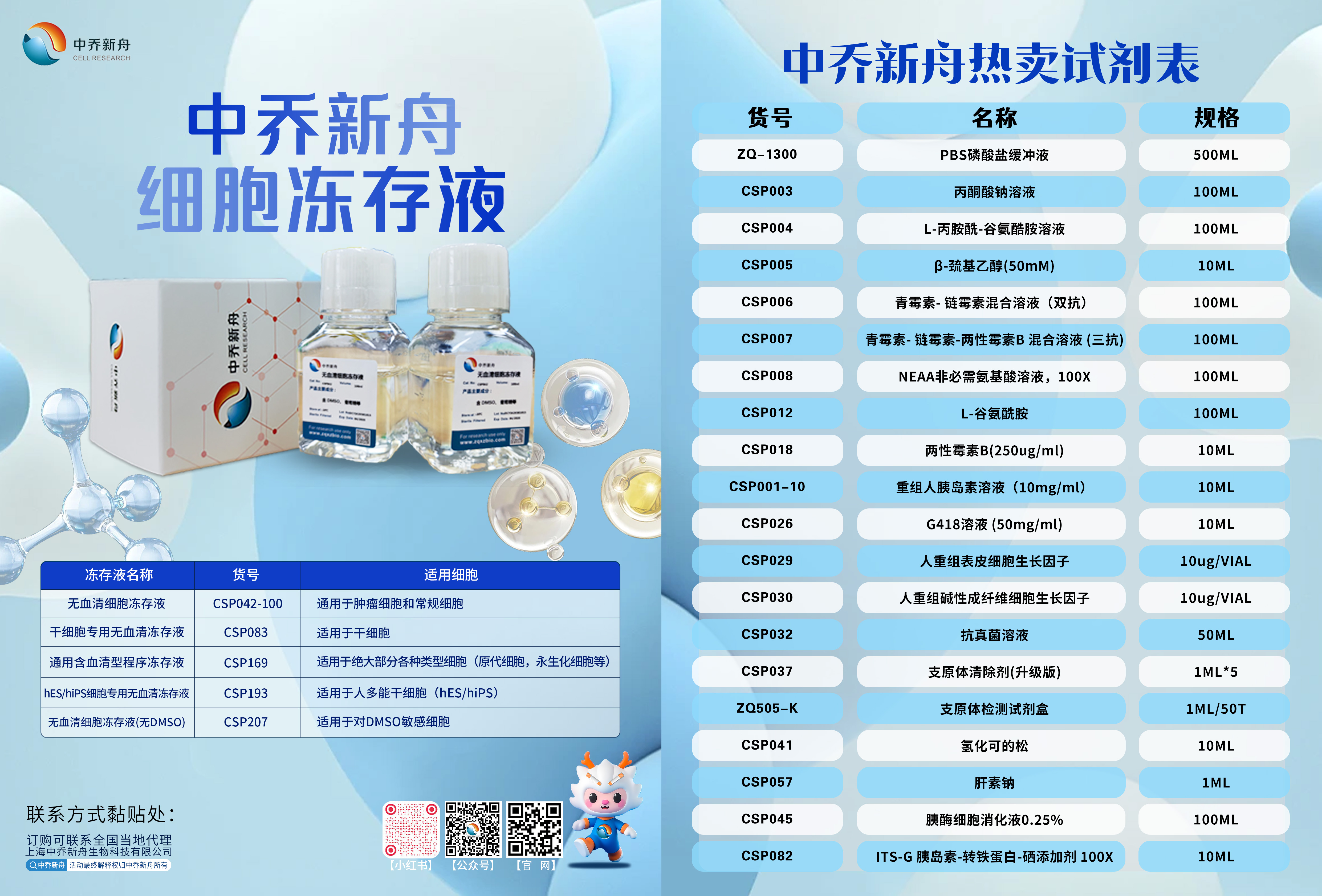 公司一直致力于为高等院校、研究机构、医院、CRO及CDMO企业提供细胞培养完整解决方案,这些产品旨在满足细胞培养的多样需求,确保实验和研究的有效进行。引用中乔新舟(ZQXZBIO)产品和服务的文献超数千篇。