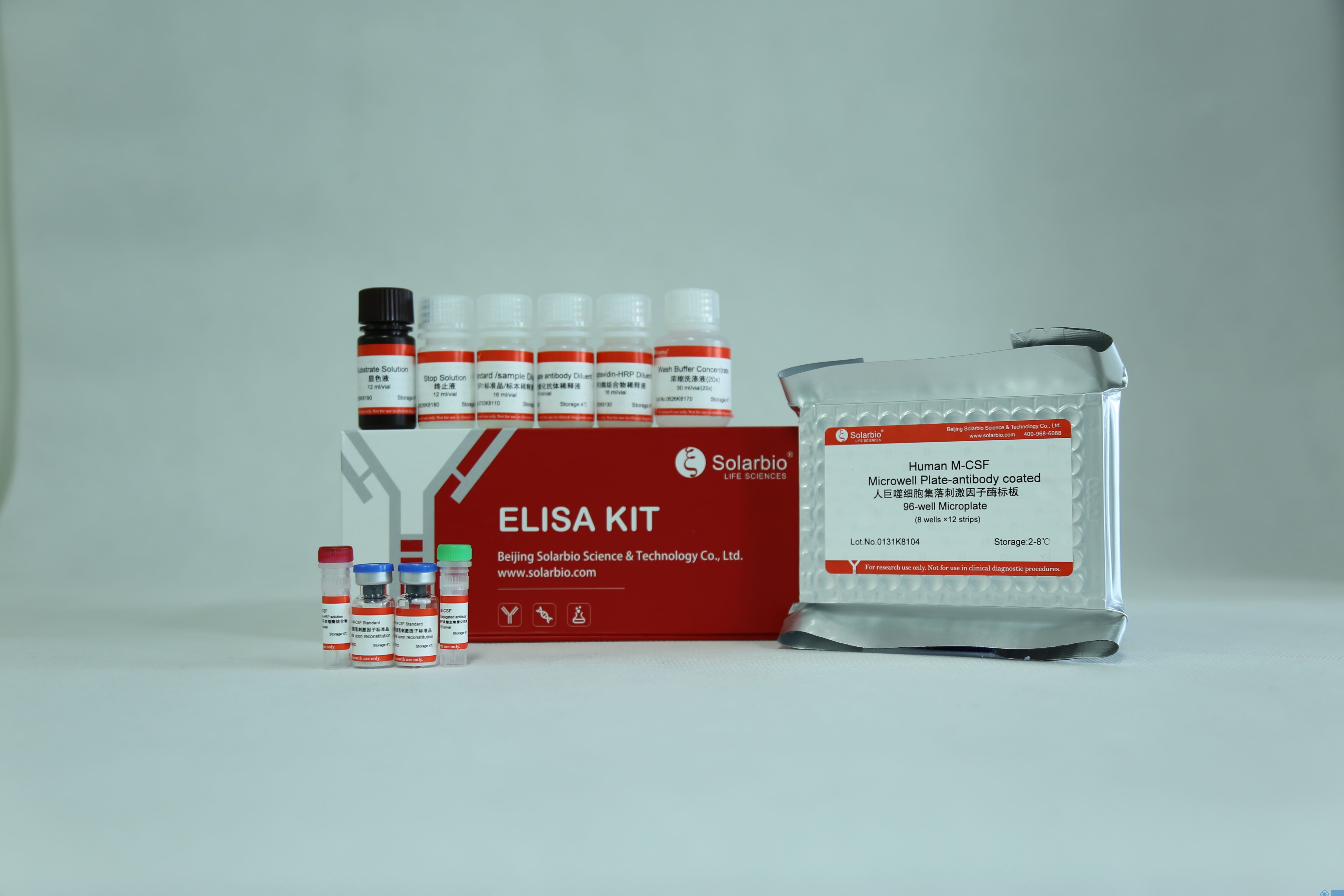 Solarbio ELISA试剂盒采用基于双抗体夹心法的酶联免疫吸附检测技术。将抗人M-CSF单克隆抗体包被在酶标板上;分别加入梯度稀释的标准品和预稀释的样本,标准品和样本中的人M-CSF会与酶标板上的包被抗体充分结合;洗板后加入生物素化抗人M-CSF抗体,该抗体会与板子上包被抗体捕获的标准品和样本中的人M-CSF发生特异性结合;洗板后加入辣根过氧化物酶(HRP)标记的链霉亲和素,生物素与链霉亲和素会发生高强度的非共价结合;洗板后加入显色剂底物TMB,若反应孔中样品存在不同浓度的人M-CSF,则HRP会使无色TMB变成不同深浅(正相关)的蓝色物质,加入终止液后反应孔会变成黄色;最后,在λmax=450 nm(OD=450 nm)处测定反应孔样品吸光度(OD),样本中的人M-CSF浓度与OD成正比,通过绘制标准曲线和四参数拟合软件便可计算出样本中人M-CSF的浓度。