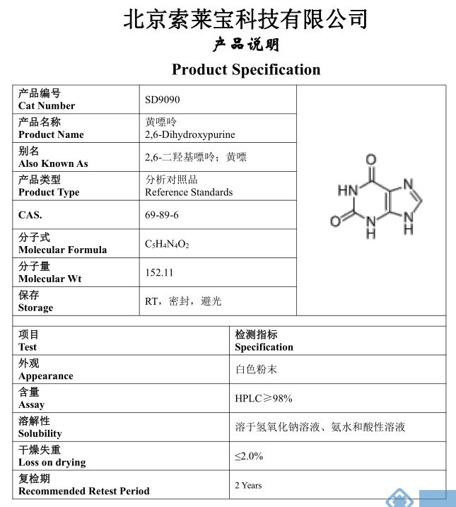 产品名称: 2,6-Dihydroxypurine;黄嘌呤